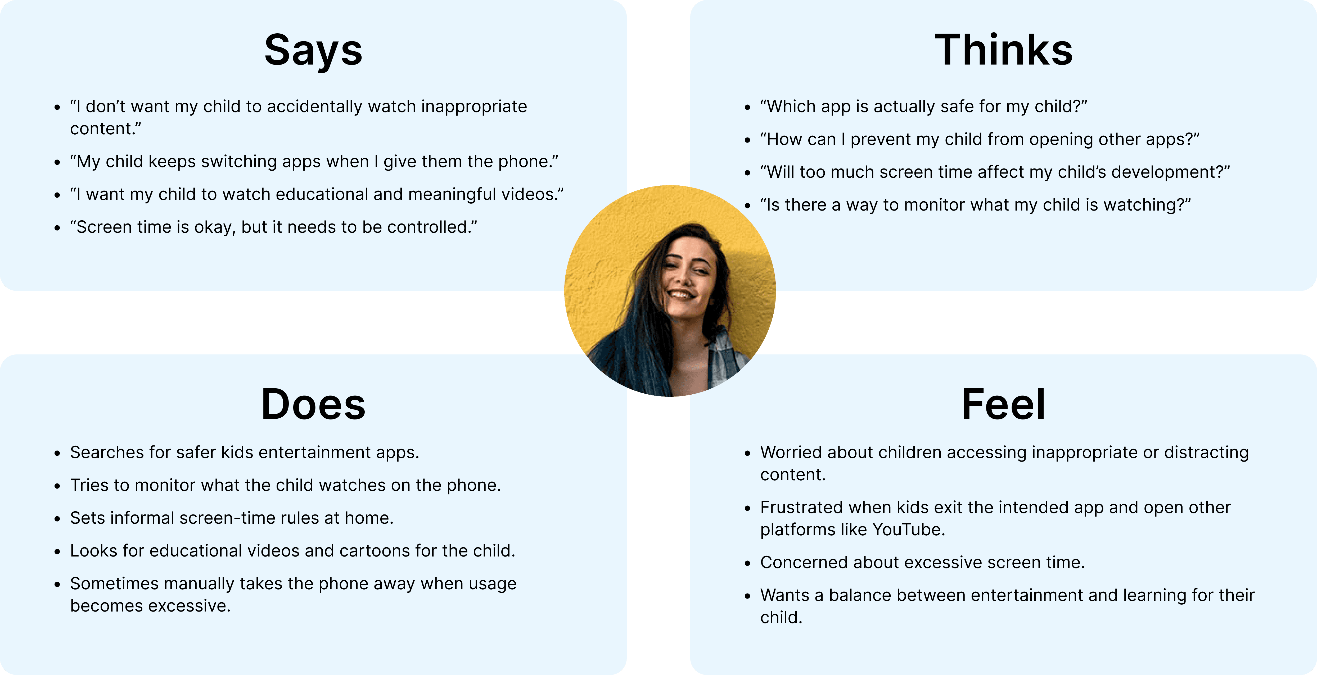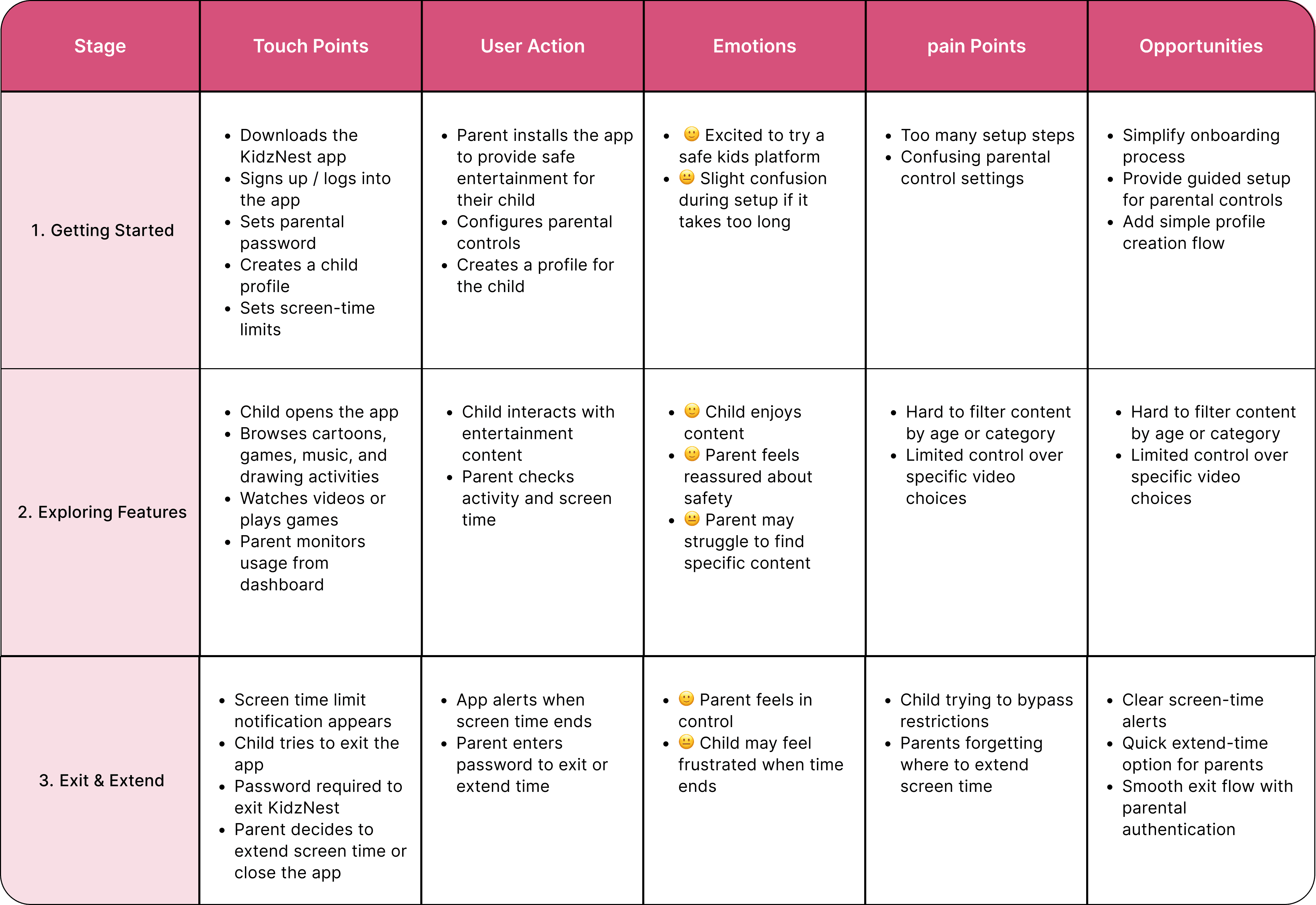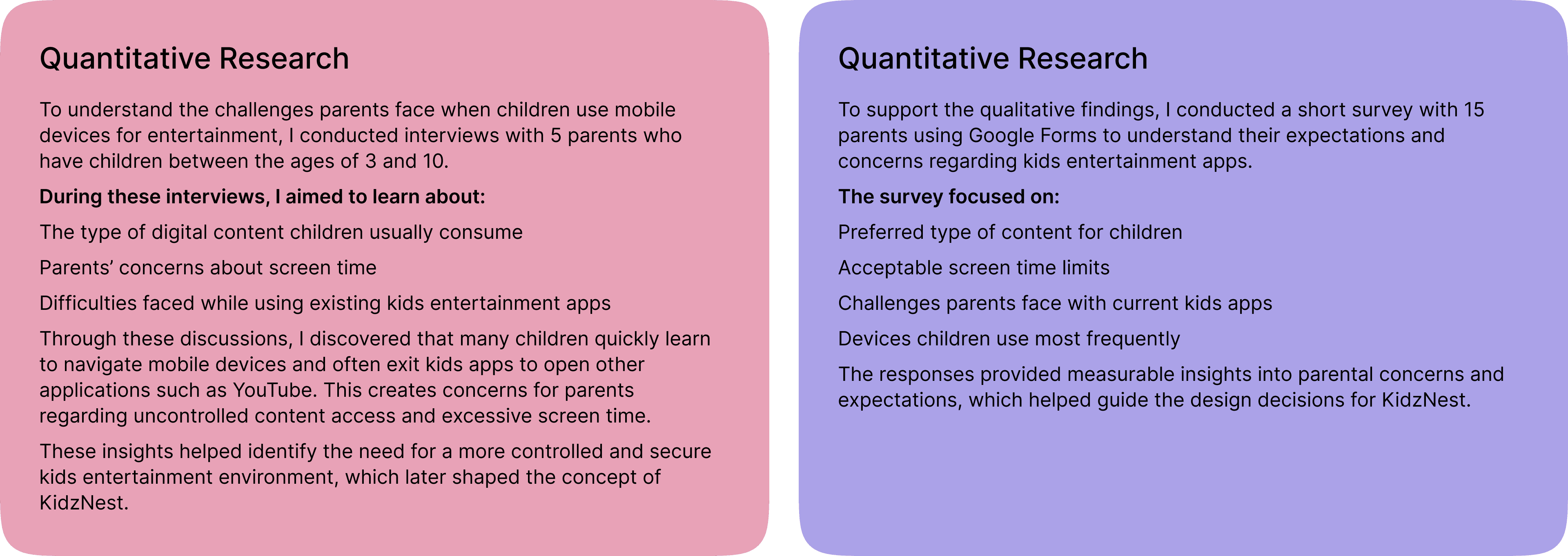 These insights confirmed the need for an app like KidzNest, which provides a safe, controlled, and engaging digital environment for children while giving parents better monitoring and control.