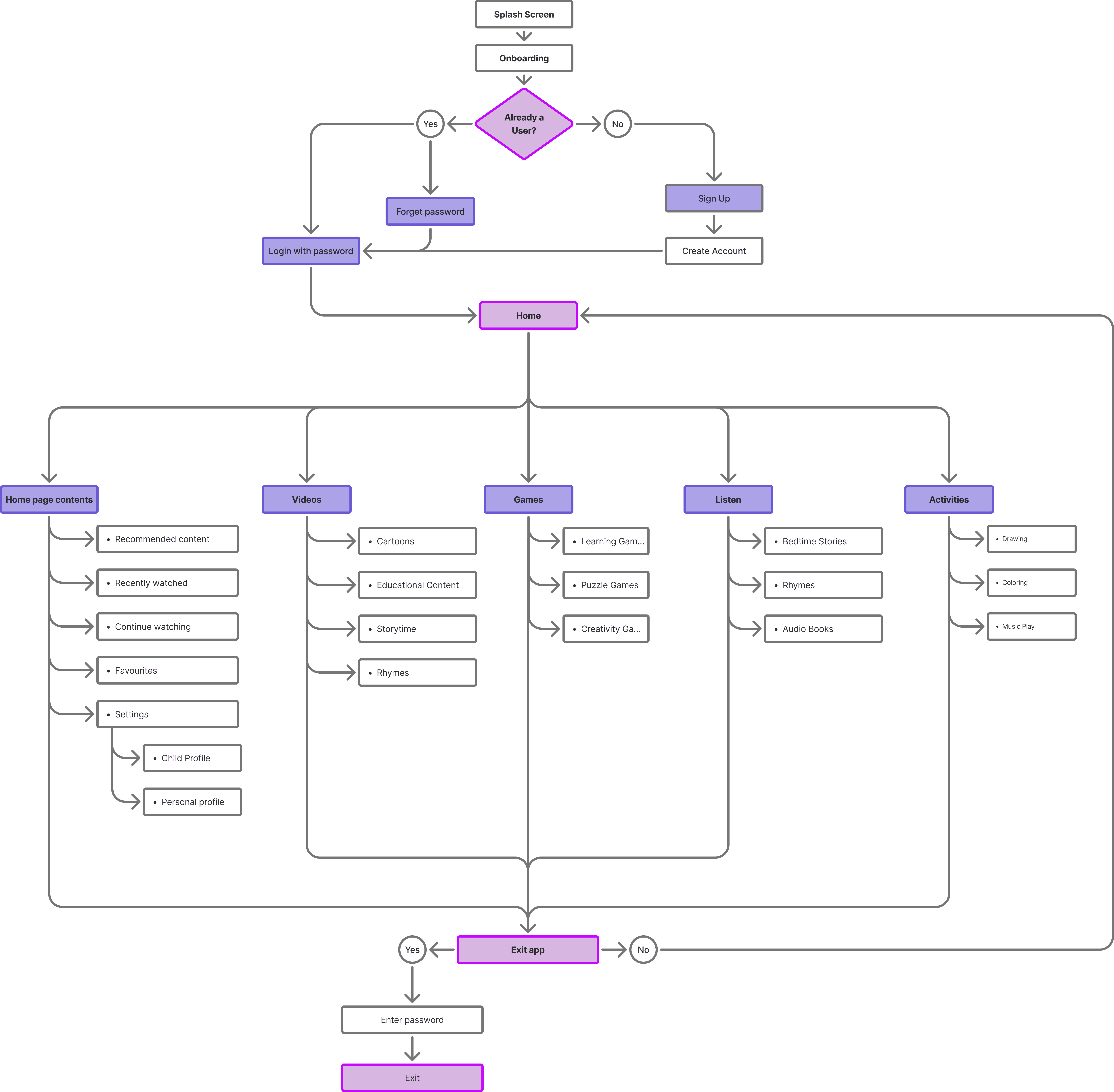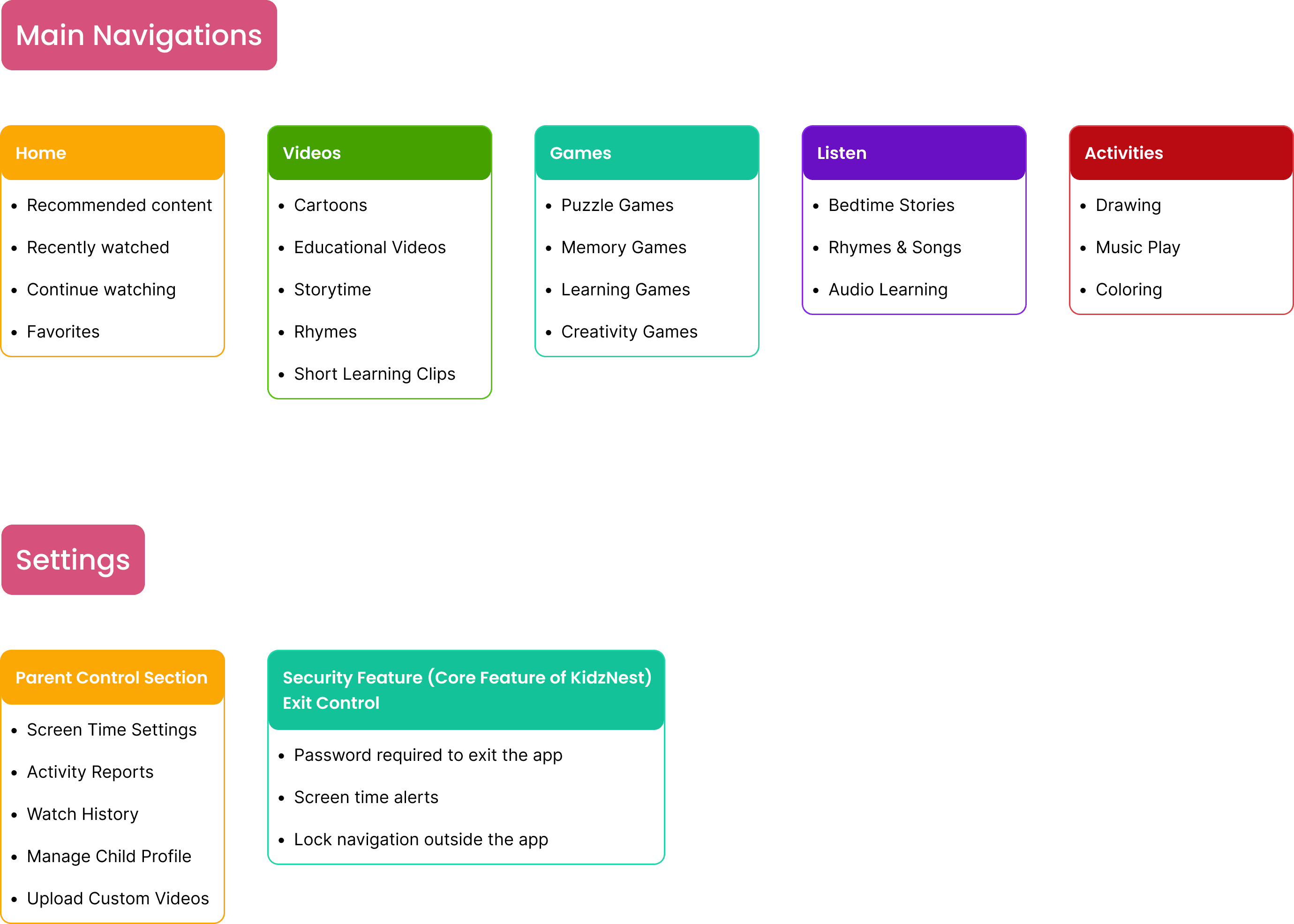 The goal of this project is to design a child-friendly entertainment platform combined with strong parental controls that allows children to enjoy digital activities safely. The app aims to: Provide a fun, engaging, and interactive environment for children Help parents monitor and manage their child's screen time Prevent children from exiting the app without parent authentication Allow parents to curate or upload selected content they want their children to watch The design focuses on creating a balance between entertainment for kids and control for parents, ensuring a safe and structured digital experience.